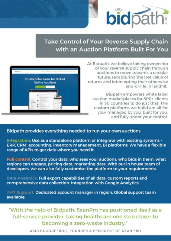 At Bidpath, we believe taking ownership of your reverse supply chain through auctions to move towards a circular future, recapturing the lost value of returns and intercepting their otherwise end-of-life in landfill. Bidpath empowers white label auction marketplaces for 800+ clients in 30 countries to do just that. The custom platforms we build are all for you- managed by you, built for you, and fully under your control.